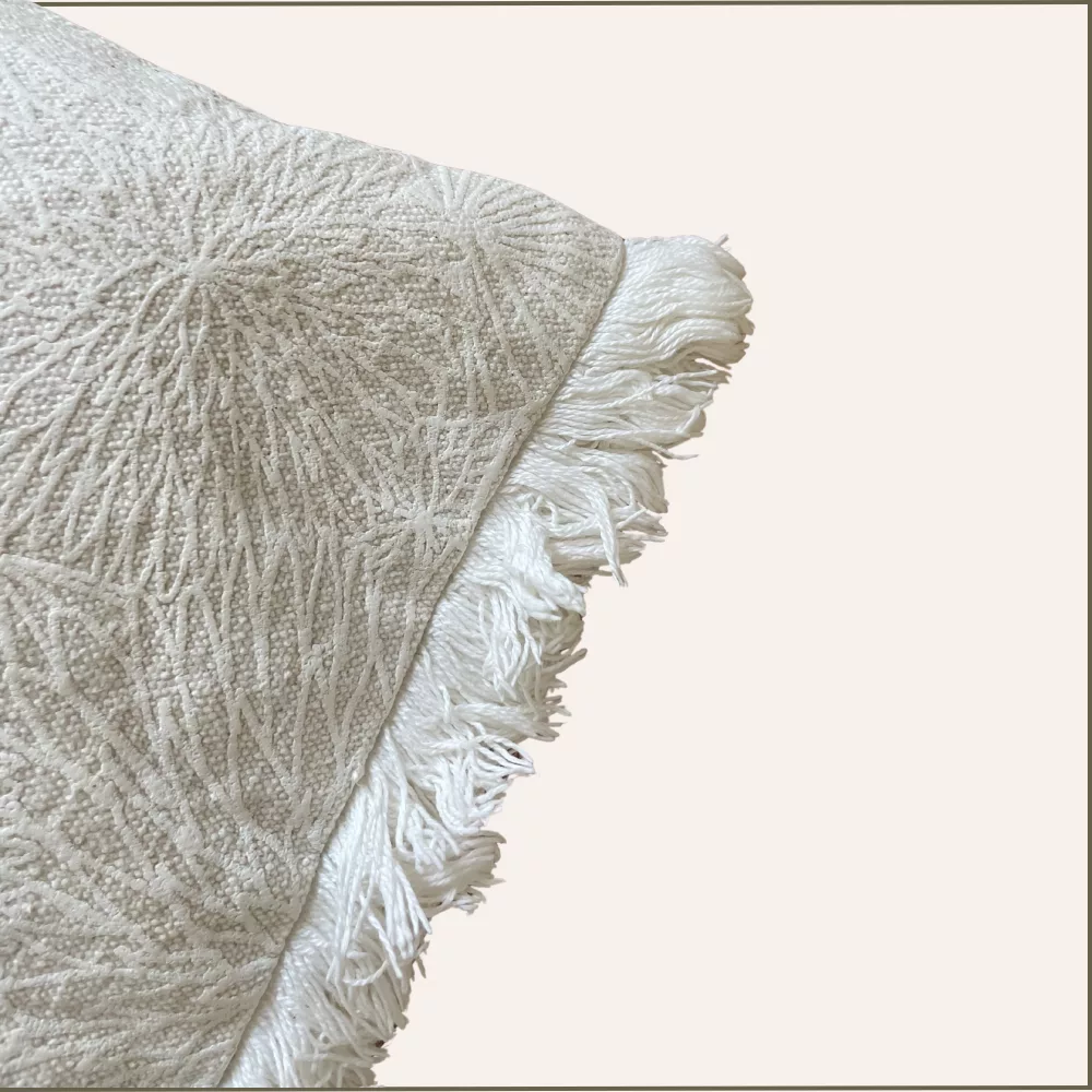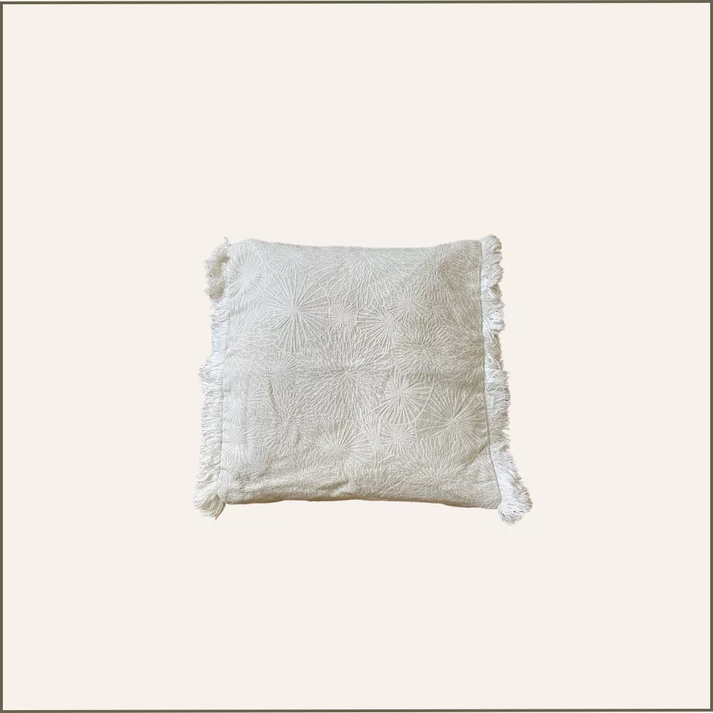Coussin carré écru et blanc à franges et motifs floraux